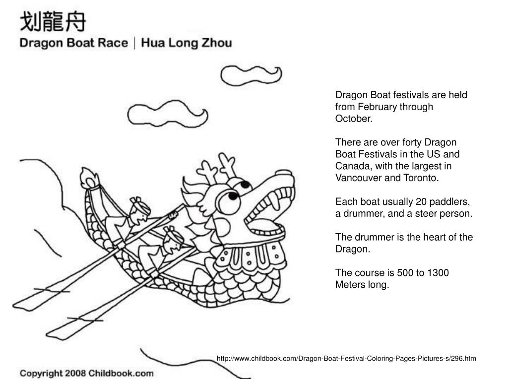 Dragon Boat festivals are held from February through October. There are over forty Dragon Boat Festivals in the US and Canada, with the largest in Vancouver and Toronto. Each boat usually 20 paddlers, a drummer, and a steer person. The drummer is the heart of the Dragon. The course is 500 to 1300 Meters long. http://www.childbook.com/Dragon-Boat-Festival-Coloring-Pages-Pictures-s/296.htm