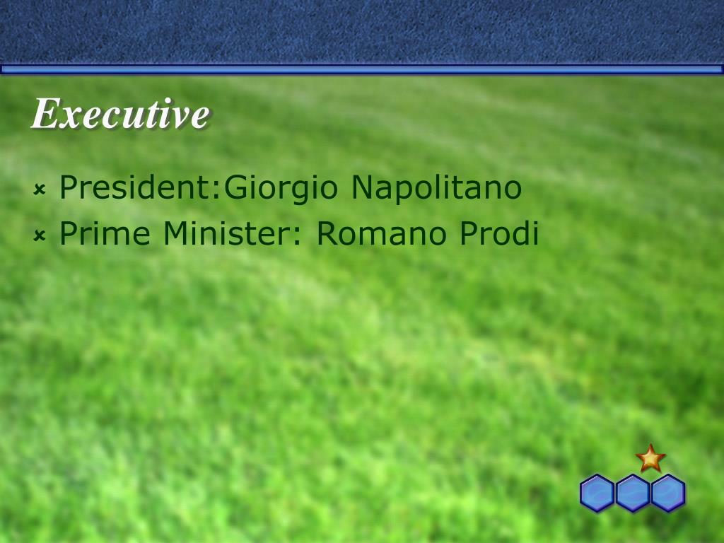 Executive • President:Giorgio Napolitano • Prime Minister: Romano Prodi