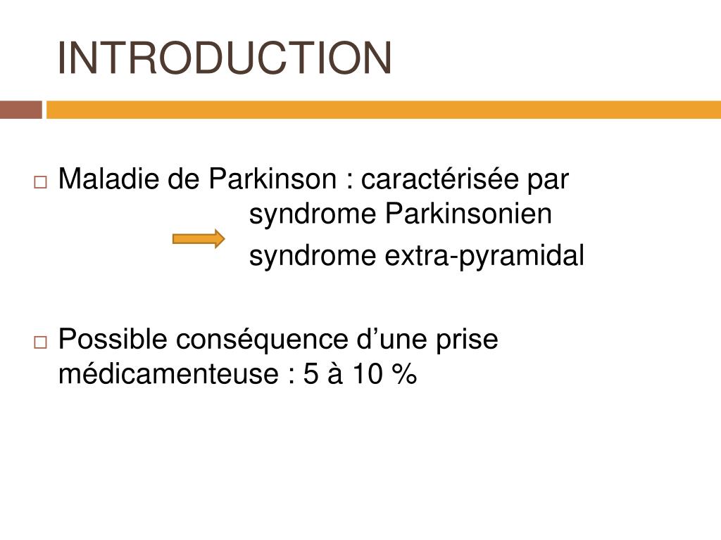 INTRODUCTION • Maladie de Parkinson : caractérisée par syndrome Parkinsonien syndrome extra-pyramidal • Possible conséquence d’une prise médicamenteuse : 5 à 10 %