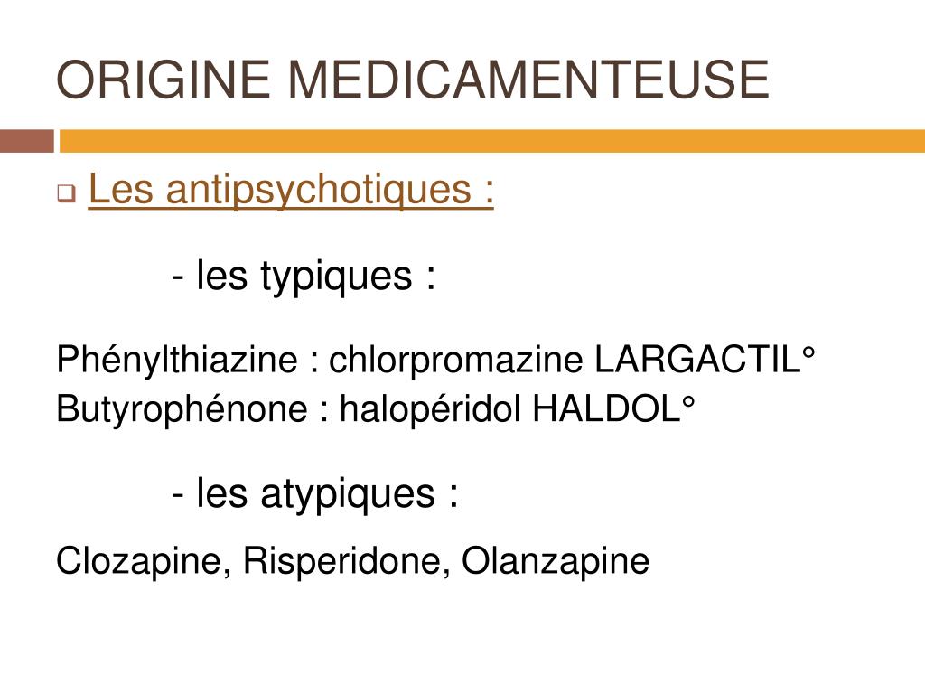 ORIGINE MEDICAMENTEUSE • Les antipsychotiques : - les typiques : Phénylthiazine : chlorpromazine LARGACTIL° Butyrophénone : halopéridol HALDOL° - les atypiques : Clozapine, Risperidone, Olanzapine