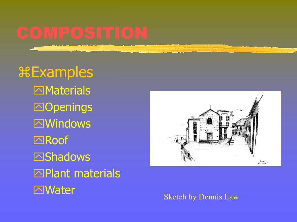 COMPOSITION • Examples • Materials • Openings • Windows • Roof • Shadows • Plant materials • Water Sketch by Dennis Law