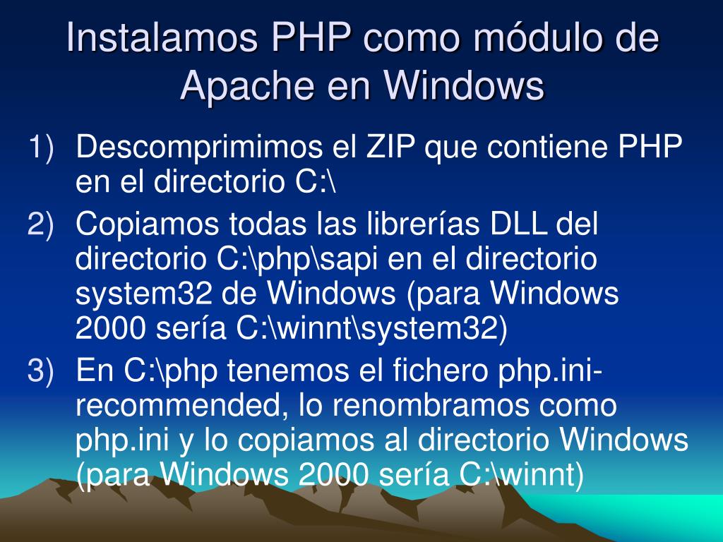 Instalamos PHP como módulo de Apache en Windows • Descomprimimos el ZIP que contiene PHP en el directorio C:\ • Copiamos todas las librerías DLL del directorio C:\php\sapi en el directorio system32 de Windows (para Windows 2000 sería C:\winnt\system32) • En C:\php tenemos el fichero php.ini-recommended, lo renombramos como php.ini y lo copiamos al directorio Windows (para Windows 2000 sería C:\winnt)