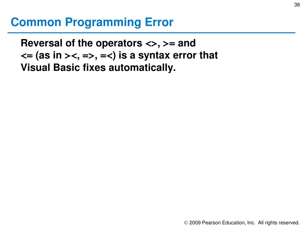 Common Programming Error • Reversal of the operators <>, >= and<= (as in ><, =>, =<) is a syntax error thatVisual Basic fixes automatically.