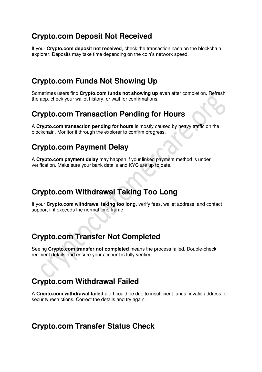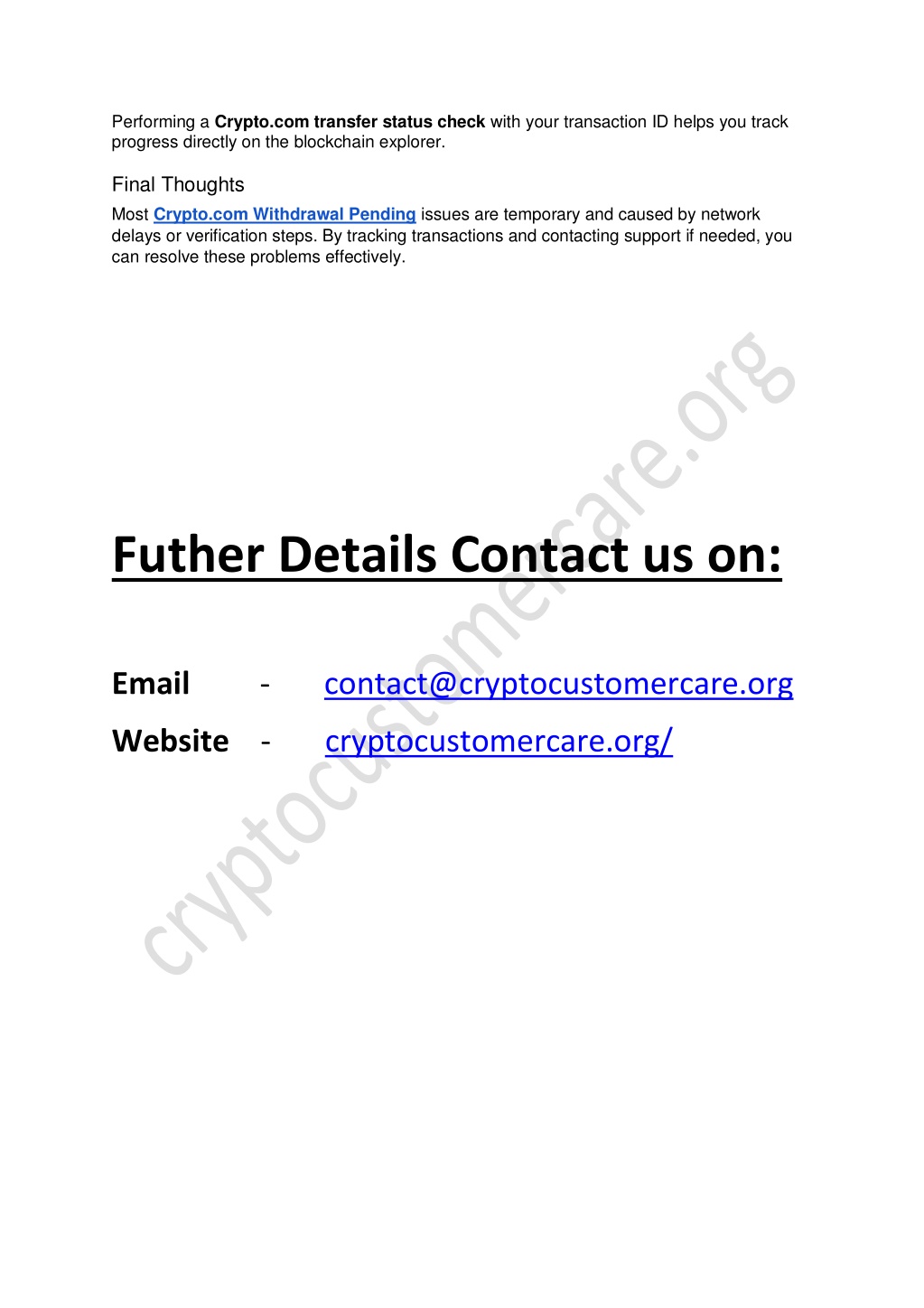 Performing a Crypto.com transfer status check with your transaction ID helps you track progress directly on the blockchain explorer. Final Thoughts Most Crypto.com Withdrawal Pending issues are temporary and caused by network delays or verification steps. By tracking transactions and contacting support if needed, you can resolve these problems effectively. Futher Details Contact us on: Email - contact@cryptocustomercare.org Website - cryptocustomercare.org/