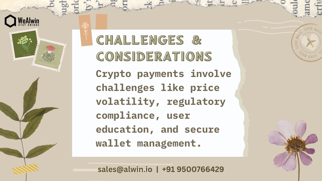 CHALLENGES & CONSIDERATIONS CONSIDERATIONS CHALLENGES & Crypto payments involve challenges like price volatility, regulatory compliance, user education, and secure wallet management. sales@alwin.io | +91 9500766429