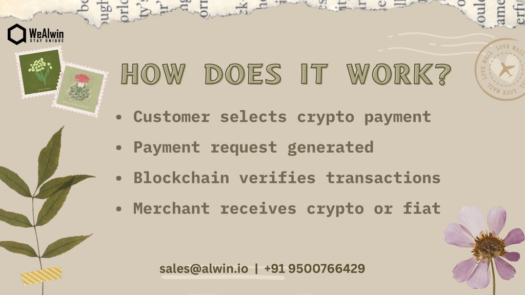 HOW DOES IT WORK? HOW DOES IT WORK? • Customer selects crypto payment • Payment request generated • Blockchain verifies transactions • Merchant receives crypto or fiat sales@alwin.io | +91 9500766429
