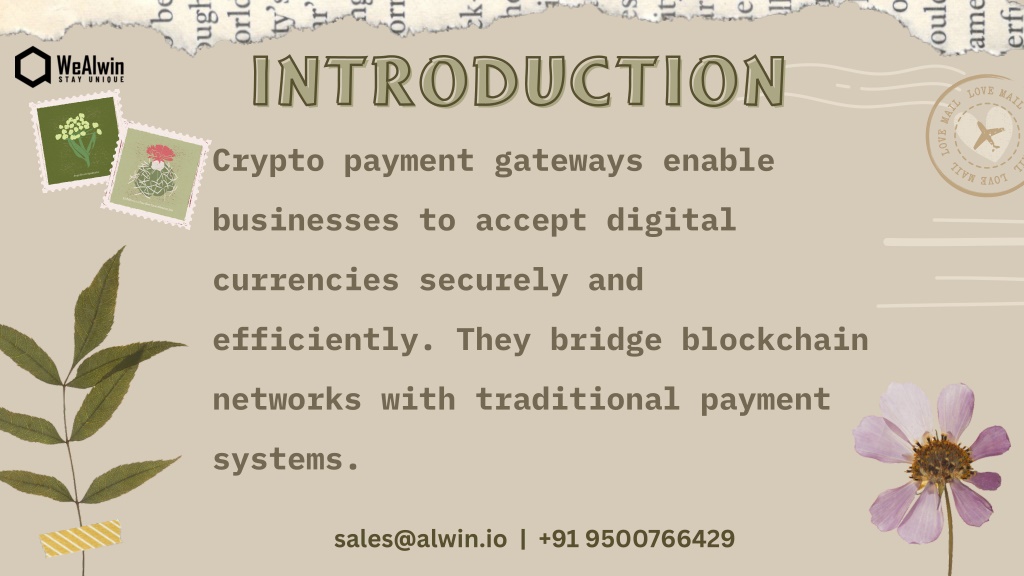 INTRODUCTION INTRODUCTION Crypto payment gateways enable businesses to accept digital currencies securely and efficiently. They bridge blockchain networks with traditional payment systems. sales@alwin.io | +91 9500766429