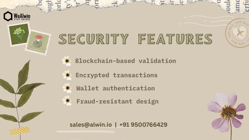 SECURITY FEATURES SECURITY FEATURES Blockchain-based validation Encrypted transactions Wallet authentication Fraud-resistant design sales@alwin.io | +91 9500766429
