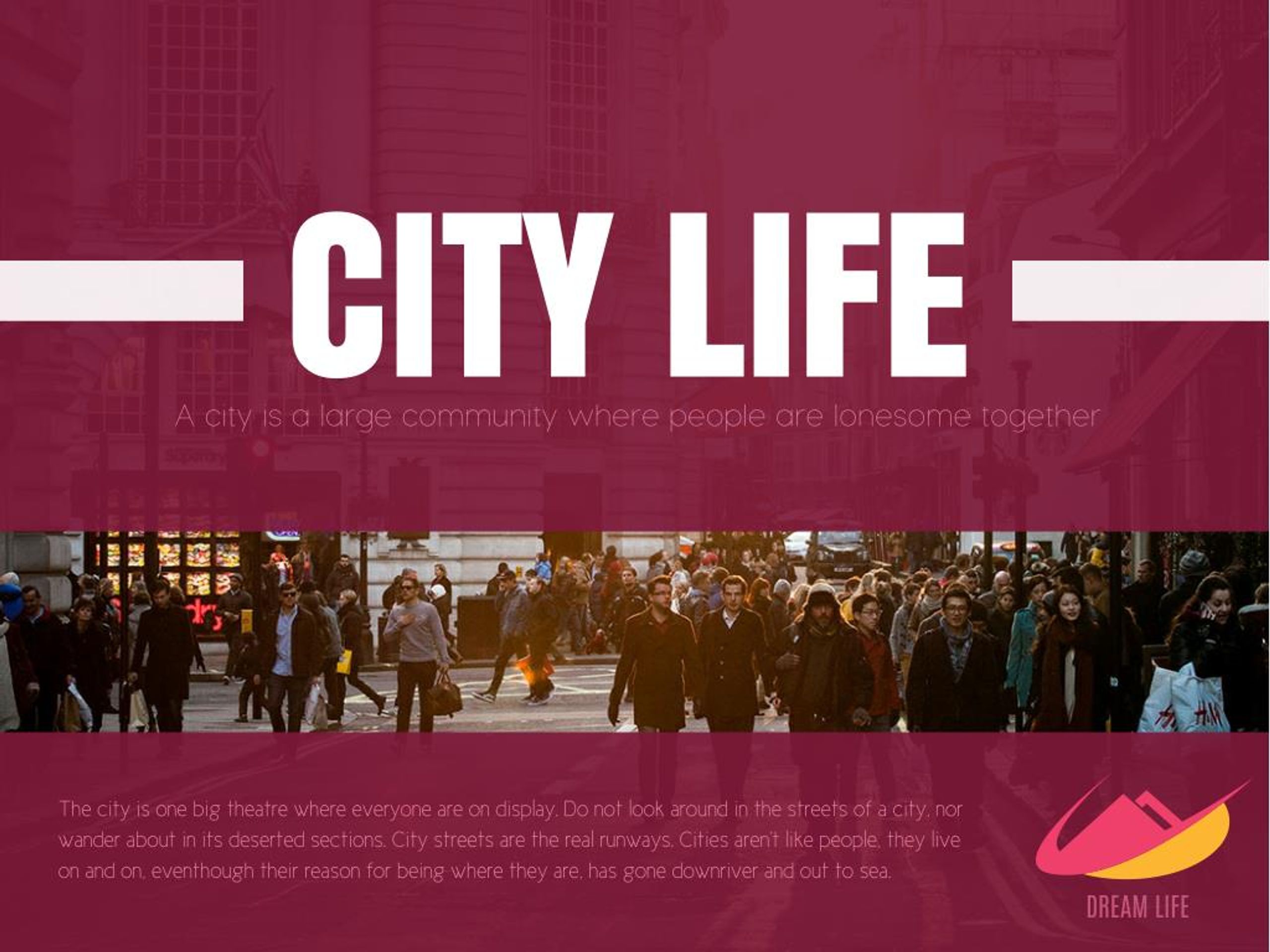 CITY LIFE A city is a large community where people are lonesome together The city is one big theatre where everyone are on display. Do not look around in the streets of a city, nor wander about in its deserted sections. City streets are the real runways. Cities aren't like people, they live on and on, eventhough their reason for being where they are, has gone downriver and out to sea. DREAM LIFE