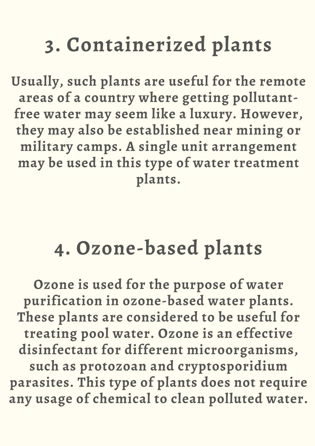 3. Containerized plants Usually, such plants are useful for the remote areas of a country where getting pollutant- free water may seem like a luxury. However, they may also be established near mining or military camps. A single unit arrangement may be used in this type of water treatment plants. 4. Ozone-based plants Ozone is used for the purpose of water purification in ozone-based water plants. These plants are considered to be useful for treating pool water. Ozone is an effective disinfectant for different microorganisms, such as protozoan and cryptosporidium parasites. This type of plants does not require any usage of chemical to clean polluted water.