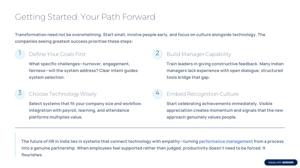 5. Getting Started: Your Path Forward Transformation need not be overwhelming. Start small, involve people early, and focus on culture alongside technology. The companies seeing greatest success prioritise these steps: 1 2 Define Your Goals First Build Manager Capability What specific challenges—turnover, engagement, fairness—will the system address? Clear intent guides system selection. Train leaders in giving constructive feedback. Many Indian managers lack experience with open dialogue; structured tools bridge that gap. 3 4 Choose Technology Wisely Embed Recognition Culture Select systems that fit your company size and workflow. Integration with payroll, learning, and attendance platforms multiplies value. Start celebrating achievements immediately. Visible appreciation creates momentum and signals that the new approach genuinely values people. The future of HR in India lies in systems that connect technology with empathy—turning performance management from a process into a genuine partnership. When employees feel supported rather than judged, productivity doesn't need to be forced. It flourishes.