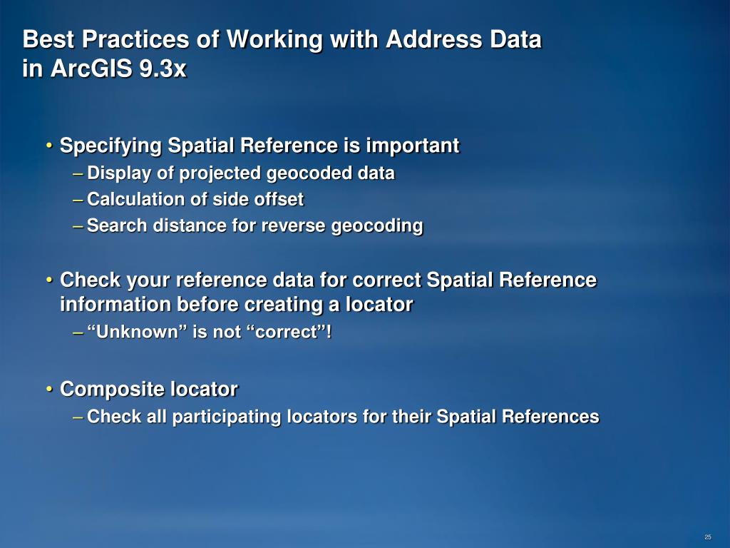 Best Practices of Working with Address Datain ArcGIS 9.3x • Specifying Spatial Reference is important • Display of projected geocoded data • Calculation of side offset • Search distance for reverse geocoding • Check your reference data for correct Spatial Reference information before creating a locator • “Unknown” is not “correct”! • Composite locator • Check all participating locators for their Spatial References