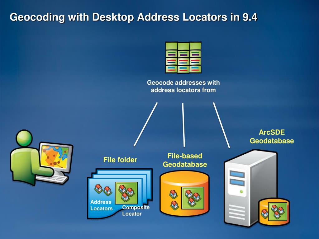Geocoding with Desktop Address Locators in 9.4 Geocode addresses withaddress locators from ArcSDE Geodatabase File folder File-based Geodatabase Address Locators Composite Locator