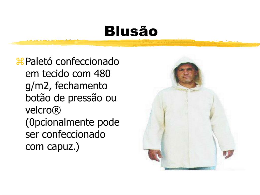 Blusão • Paletó confeccionado em tecido com 480 g/m2, fechamento botão de pressão ou velcro®(0pcionalmente pode ser confeccionado com capuz.)