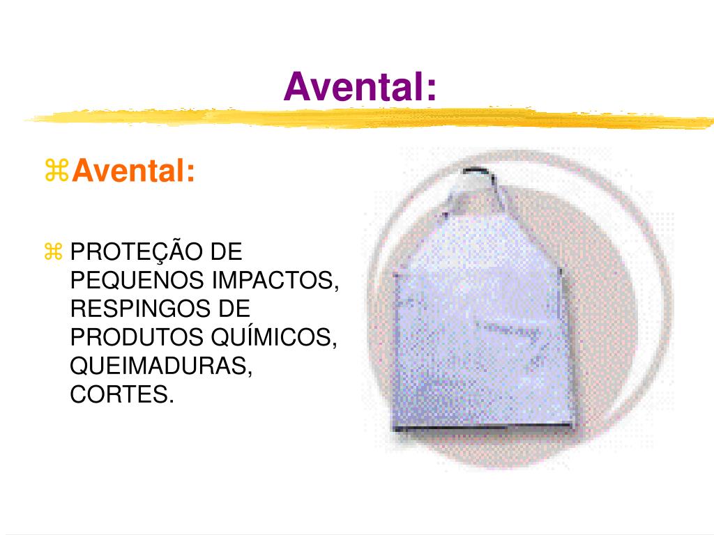 Avental: • Avental: • PROTEÇÃO DE PEQUENOS IMPACTOS, RESPINGOS DE PRODUTOS QUÍMICOS, QUEIMADURAS, CORTES.