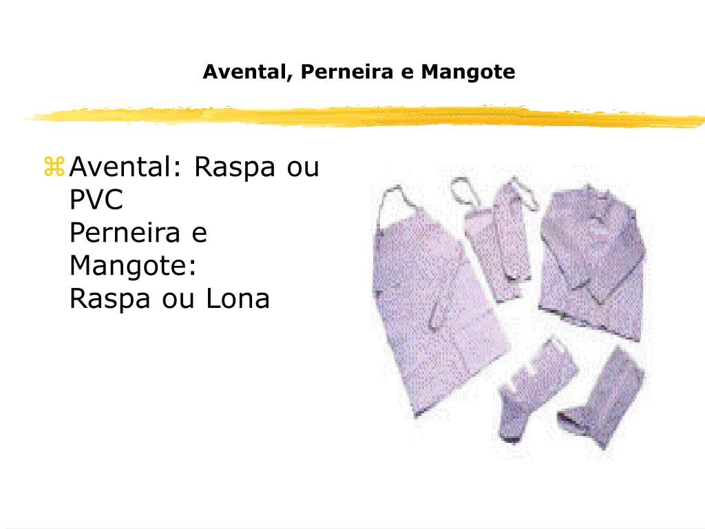 Avental, Perneira e Mangote • Avental: Raspa ou PVC Perneira e Mangote: Raspa ou Lona