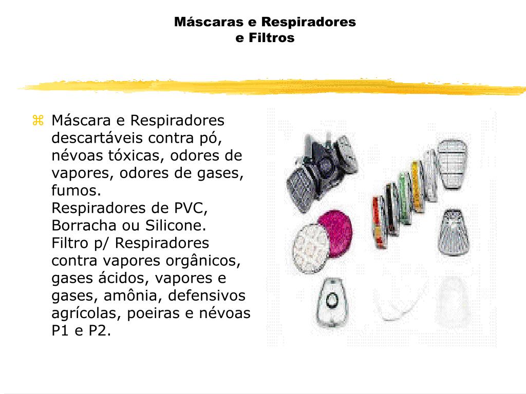 Máscaras e Respiradores e Filtros • Máscara e Respiradores descartáveis contra pó, névoas tóxicas, odores de vapores, odores de gases, fumos.Respiradores de PVC, Borracha ou Silicone.Filtro p/ Respiradores contra vapores orgânicos, gases ácidos, vapores e gases, amônia, defensivos agrícolas, poeiras e névoas P1 e P2.