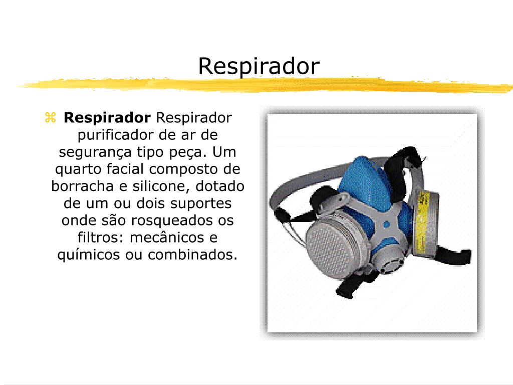 Respirador • Respirador Respirador purificador de ar de segurança tipo peça. Um quarto facial composto de borracha e silicone, dotado de um ou dois suportes onde são rosqueados os filtros: mecânicos e químicos ou combinados.