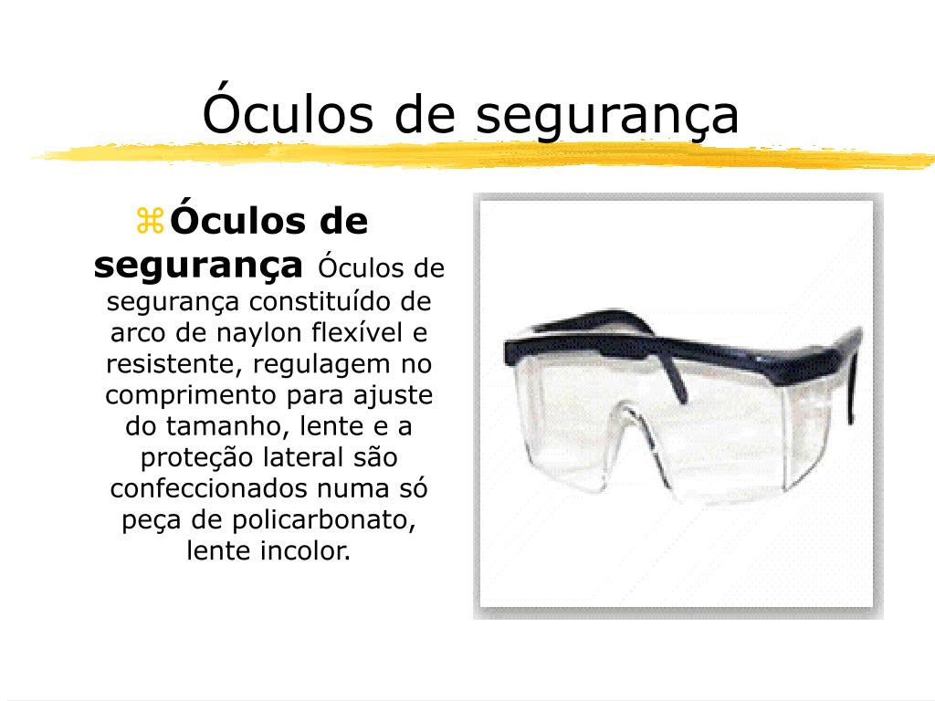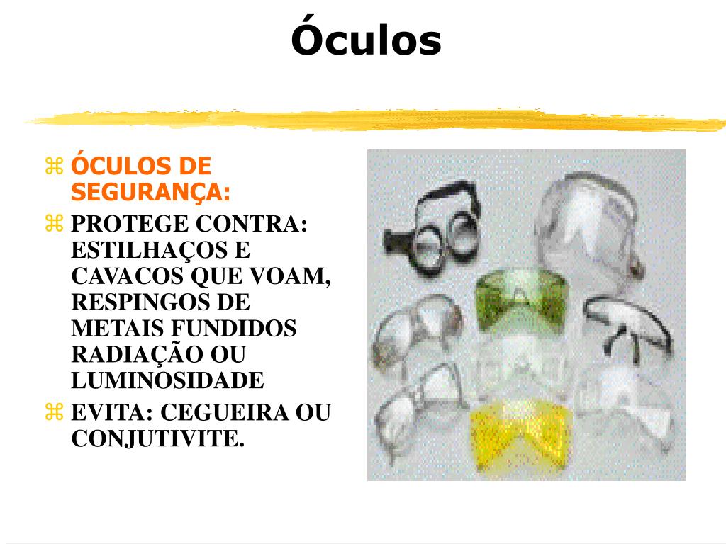 Óculos • ÓCULOS DE SEGURANÇA: • PROTEGE CONTRA: ESTILHAÇOS E CAVACOS QUE VOAM, RESPINGOS DE METAIS FUNDIDOS RADIAÇÃO OU LUMINOSIDADE • EVITA: CEGUEIRA OU CONJUTIVITE.