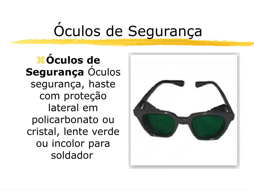 Óculos de Segurança • Óculos de Segurança Óculos segurança, haste com proteção lateral em policarbonato ou cristal, lente verde ou incolor para soldador.