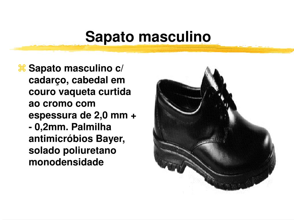 Sapato masculino • Sapato masculino c/ cadarço, cabedal em couro vaqueta curtida ao cromo com espessura de 2,0 mm + - 0,2mm. Palmilha antimicróbios Bayer, solado poliuretano monodensidade