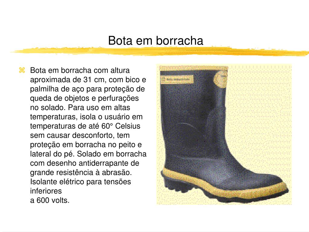 Bota em borracha • Bota em borracha com altura aproximada de 31 cm, com bico e palmilha de aço para proteção de queda de objetos e perfurações no solado. Para uso em altas temperaturas, isola o usuário em temperaturas de até 60° Celsius sem causar desconforto, tem proteção em borracha no peito e lateral do pé. Solado em borracha com desenho antiderrapante de grande resistência à abrasão. Isolante elétrico para tensões inferiores a 600 volts.