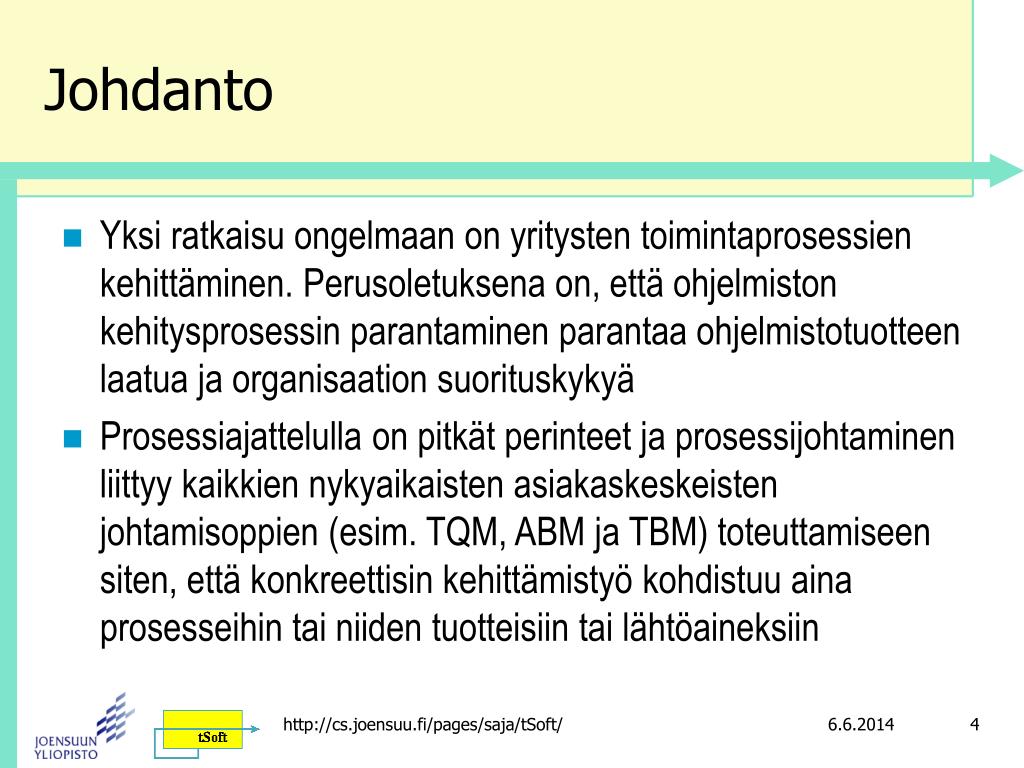 Johdanto • Yksi ratkaisu ongelmaan on yritysten toimintaprosessien kehittäminen. Perusoletuksena on, että ohjelmiston kehitysprosessin parantaminen parantaa ohjelmistotuotteen laatua ja organisaation suorituskykyä • Prosessiajattelulla on pitkät perinteet ja prosessijohtaminen liittyy kaikkien nykyaikaisten asiakaskeskeisten johtamisoppien (esim. TQM, ABM ja TBM) toteuttamiseen siten, että konkreettisin kehittämistyö kohdistuu aina prosesseihin tai niiden tuotteisiin tai lähtöaineksiin