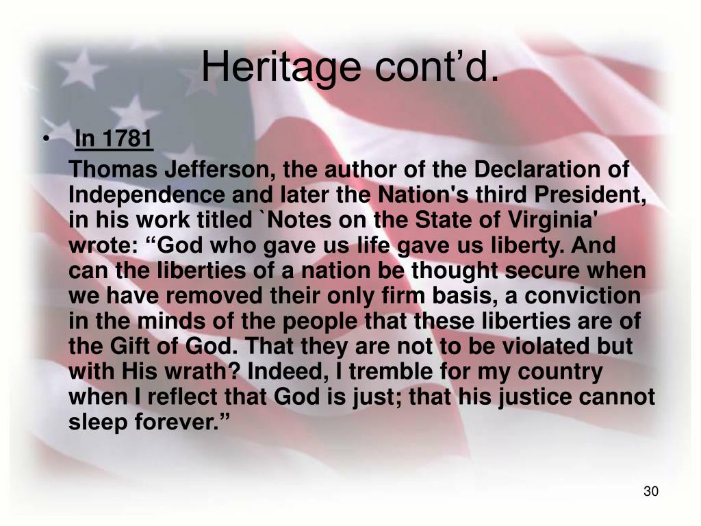 Heritage cont’d. • In 1781 Thomas Jefferson, the author of the Declaration of Independence and later the Nation's third President, in his work titled `Notes on the State of Virginia' wrote: “God who gave us life gave us liberty. And can the liberties of a nation be thought secure when we have removed their only firm basis, a conviction in the minds of the people that these liberties are of the Gift of God. That they are not to be violated but with His wrath? Indeed, I tremble for my country when I reflect that God is just; that his justice cannot sleep forever.”