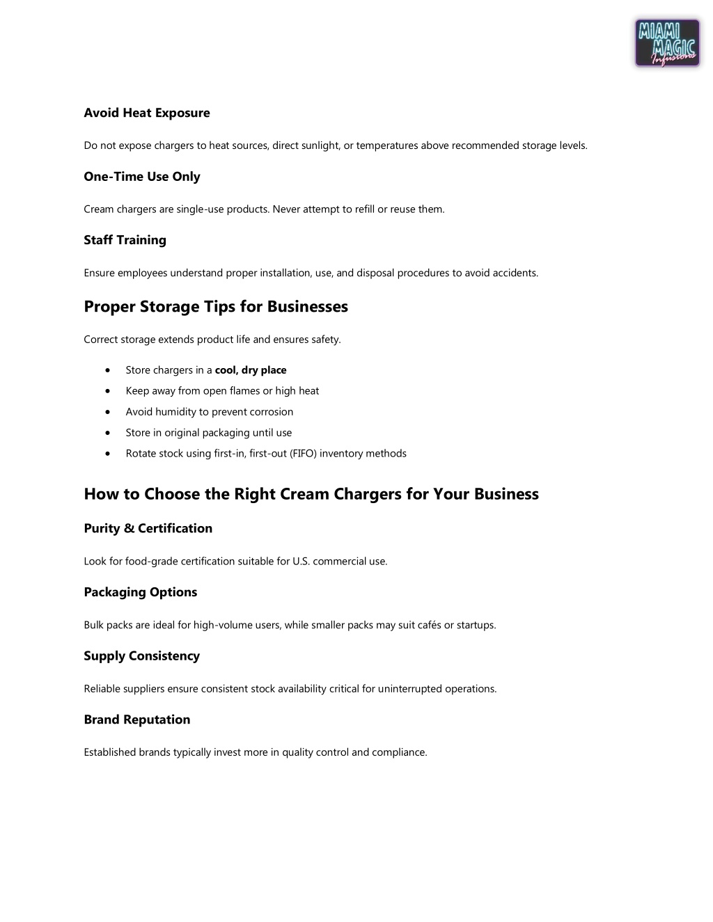 Why Businesses Partner with Trusted Suppliers For commercial buyers, sourcing matters. A reliable supplier ensures: Consistent gas quality Secure packaging and transport Compliance with U.S. safety standards Support for bulk and recurring orders Many foodservice professionals across the U.S. rely on Brands like Miami Magic or Supreme Whip as a dependable source of high-quality cream chargers designed for commercial use. Learn more about their professional-grade offerings at Miami Magic. Cream chargers are a simple but powerful tool in modern foodservice operations. By understanding how whipped cream chargers work, their benefits, and how to use and store them safely, businesses can make smarter purchasing decisions. When sourced from a trusted supplier and used correctly, cream chargers help businesses operate faster, cleaner, and more efficiently in today’s competitive U.S. market.
