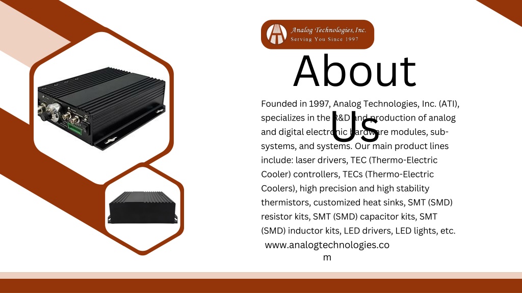 About Us Founded in 1997, Analog Technologies, Inc. (ATI), specializes in the R&D and production of analog and digital electronic hardware modules, sub-systems, and systems. Our main product lines include: laser drivers, TEC (Thermo-Electric Cooler) controllers, TECs (Thermo-Electric Coolers), high precision and high stability thermistors, customized heat sinks, SMT (SMD) resistor kits, SMT (SMD) capacitor kits, SMT (SMD) inductor kits, LED drivers, LED lights, etc. www.analogtechnologies.com