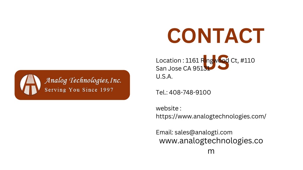 CONTACT US Location : 1161 Ringwood Ct, #110 San Jose CA 95131 U.S.A. Tel.: 408-748-9100 website : https://www.analogtechnologies.com/ Email: sales@analogti.com www.analogtechnologies.com