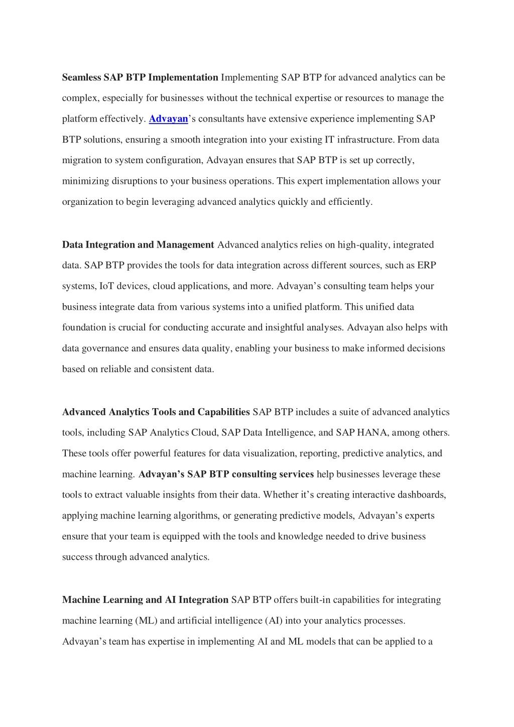 wide range of business functions. From predictive maintenance to customer churn prediction, AI and ML can help businesses unlock new levels of automation and accuracy in decision- making. Advayan’s consultants work with you to integrate these technologies into your analytics framework, ensuring that your business can make smarter, data-driven decisions. Real-Time Data Processing and Analytics One of the most valuable features of SAP BTP is its ability to process and analyze data in real-time. In today’s fast-paced business environment, real-time analytics is essential for making immediate decisions. Advayan helps your business leverage SAP BTP’s real-time analytics capabilities, enabling you to monitor key metrics and respond to changes quickly. Whether you’re tracking inventory levels, customer feedback, or sales performance, real-time insights empower businesses to take immediate action, improving operational efficiency and responsiveness. Ongoing Support and Optimization The implementation of SAP BTP is not a one-time event; it requires ongoing support to ensure the platform continues to meet your business needs. Advayan offers ongoing maintenance, optimization, and training services to help your team get the most out of SAP BTP. As your business evolves, Advayan helps optimize your SAP BTP solution, ensuring that it continues to drive value and provide actionable insights. Whether it’s tuning performance, adding new features, or scaling the platform to meet growing data needs, Advayan’s support ensures that your investment in SAP BTP continues to deliver long-term results. Why Choose Advayan for SAP BTP Consulting Services? Advayan stands out as a trusted partner for SAP BTP consulting due to its deep technical expertise, industry experience, and commitment to delivering results. Their consultants have a proven track record of helping businesses unlock the full potential of SAP BTP, particularly in the area of advanced analytics. Advayan takes a strategic approach to every project, ensuring