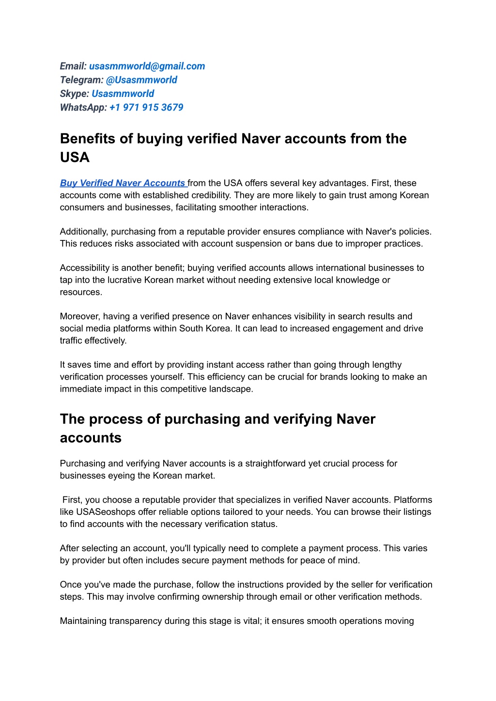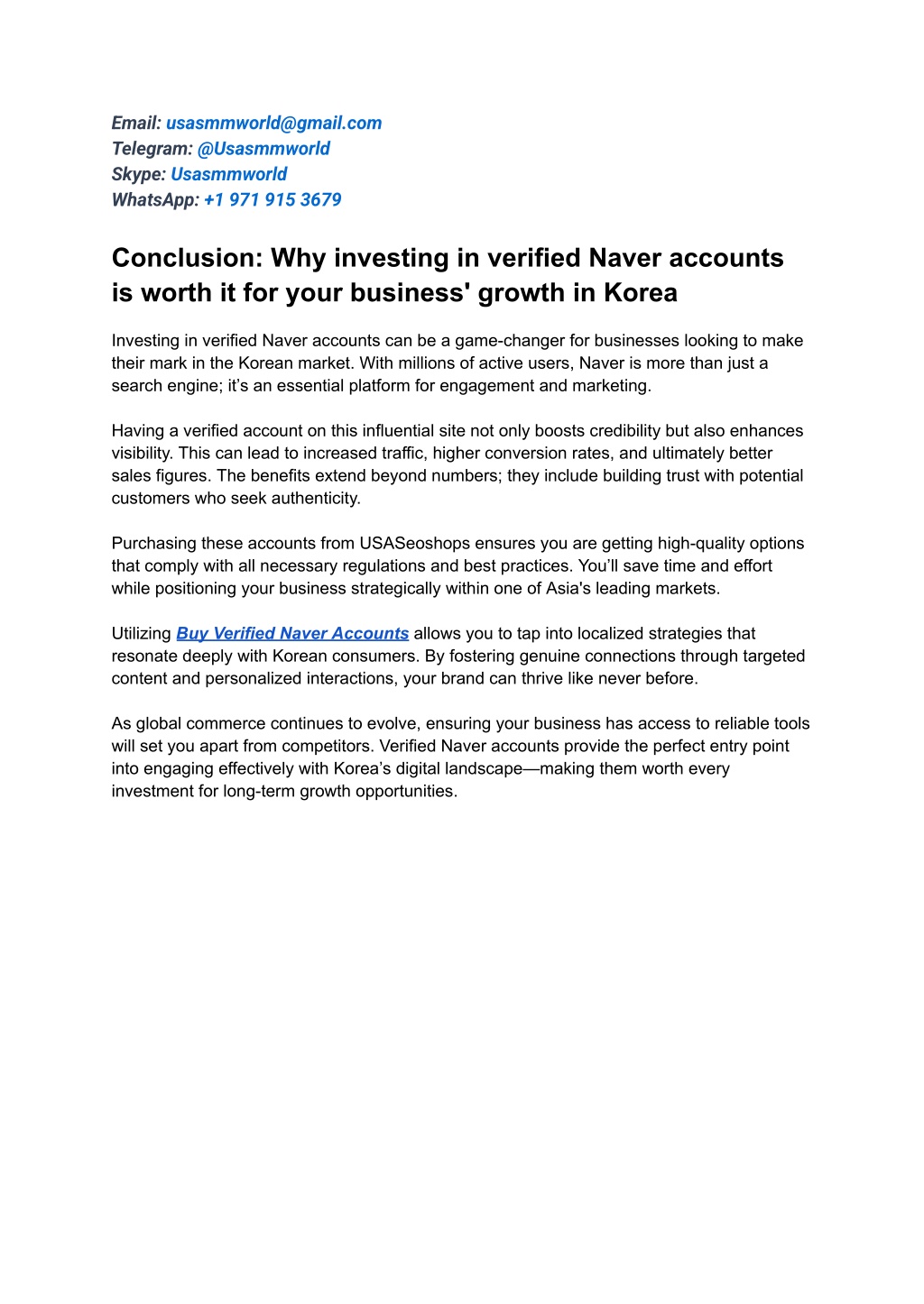 6. Email: usasmmworld@gmail.com Telegram: @Usasmmworld Skype: Usasmmworld WhatsApp: +1 971 915 3679 Conclusion: Why investing in verified Naver accounts is worth it for your business' growth in Korea Investing in verified Naver accounts can be a game-changer for businesses looking to make their mark in the Korean market. With millions of active users, Naver is more than just a search engine; it’s an essential platform for engagement and marketing. Having a verified account on this influential site not only boosts credibility but also enhances visibility. This can lead to increased traffic, higher conversion rates, and ultimately better sales figures. The benefits extend beyond numbers; they include building trust with potential customers who seek authenticity. Purchasing these accounts from USASeoshops ensures you are getting high-quality options that comply with all necessary regulations and best practices. You’ll save time and effort while positioning your business strategically within one of Asia's leading markets. Utilizing Buy Verified Naver Accounts allows you to tap into localized strategies that resonate deeply with Korean consumers. By fostering genuine connections through targeted content and personalized interactions, your brand can thrive like never before. As global commerce continues to evolve, ensuring your business has access to reliable tools will set you apart from competitors. Verified Naver accounts provide the perfect entry point into engaging effectively with Korea’s digital landscape—making them worth every investment for long-term growth opportunities.