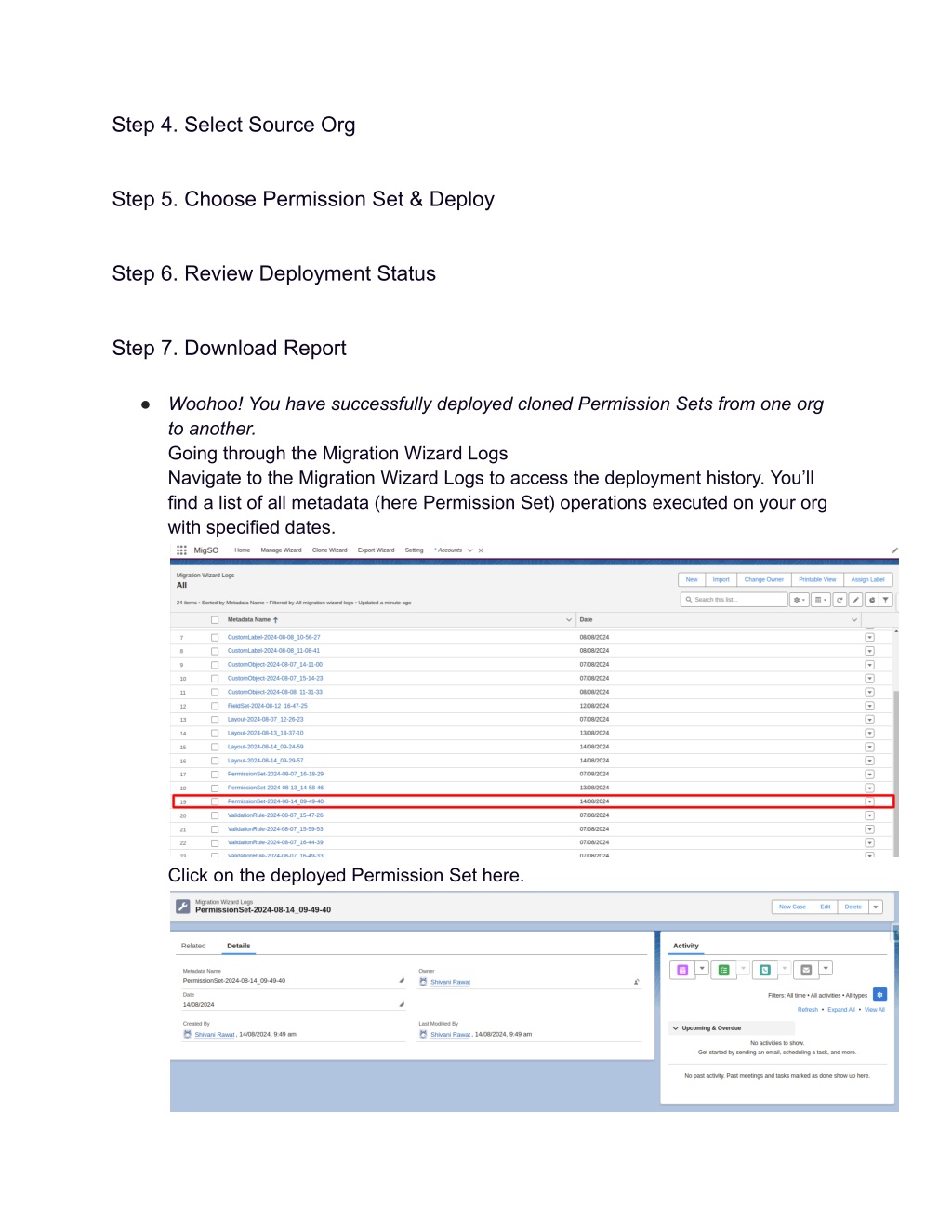 Step 4. Select Source Org Step 5. Choose Permission Set & Deploy Step 6. Review Deployment Status Step 7. Download Report ● Woohoo! You have successfully deployed cloned Permission Sets from one org to another. Going through the Migration Wizard Logs Navigate to the Migration Wizard Logs to access the deployment history. You’ll find a list of all metadata (here Permission Set) operations executed on your org with specified dates. Click on the deployed Permission Set here.