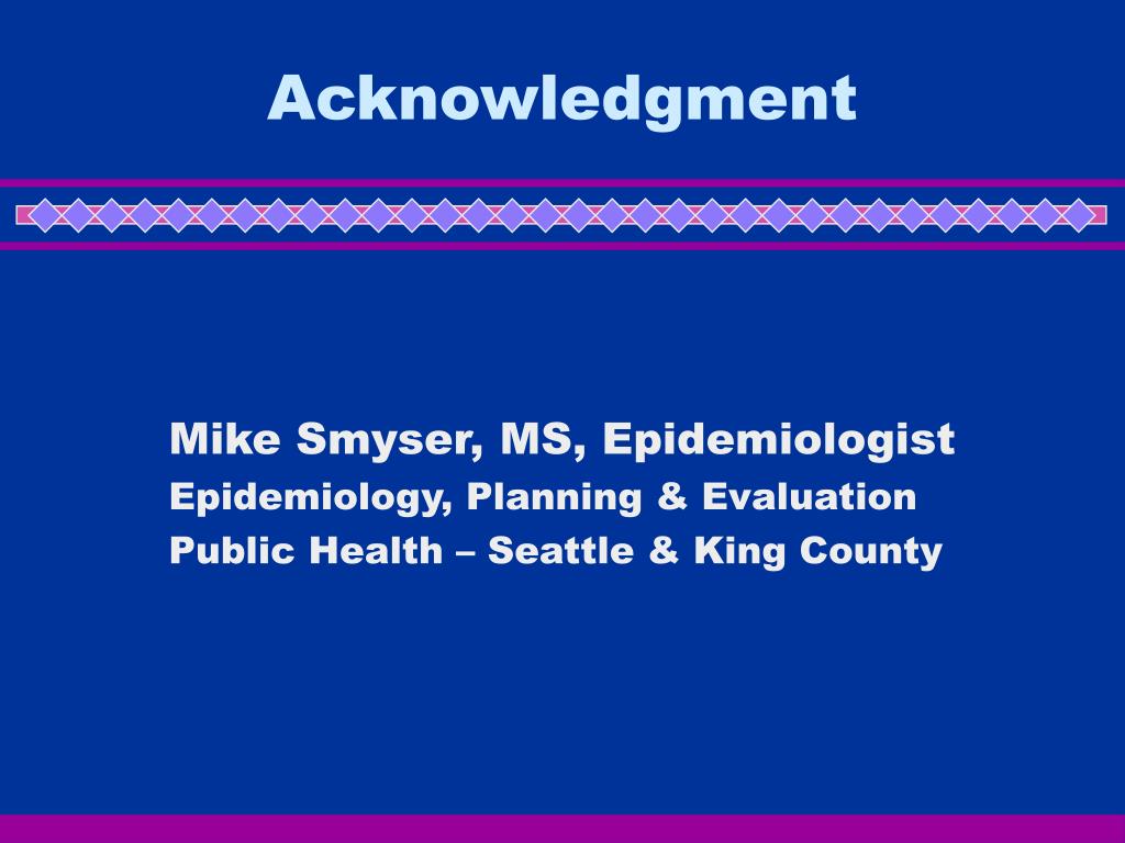 Acknowledgment Mike Smyser, MS, Epidemiologist Epidemiology, Planning & Evaluation Public Health – Seattle & King County