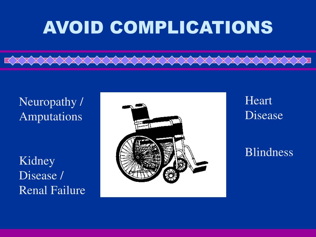 AVOID COMPLICATIONS Heart Disease Blindness Neuropathy / Amputations Kidney Disease / Renal Failure