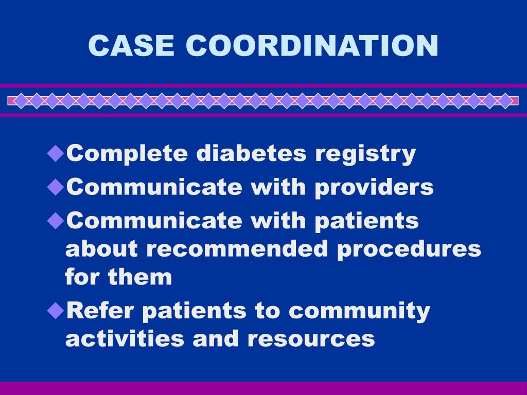 CASE COORDINATION • Complete diabetes registry • Communicate with providers • Communicate with patients about recommended procedures for them • Refer patients to community activities and resources