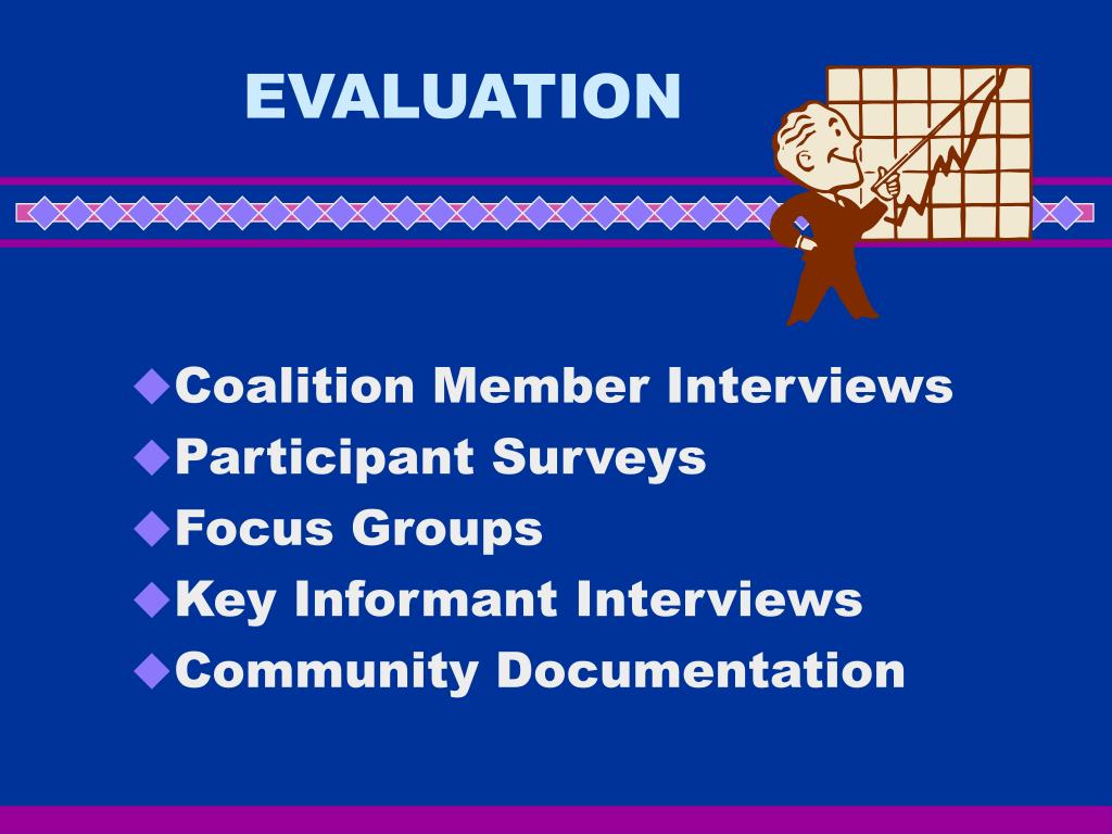 EVALUATION • Coalition Member Interviews • Participant Surveys • Focus Groups • Key Informant Interviews • Community Documentation