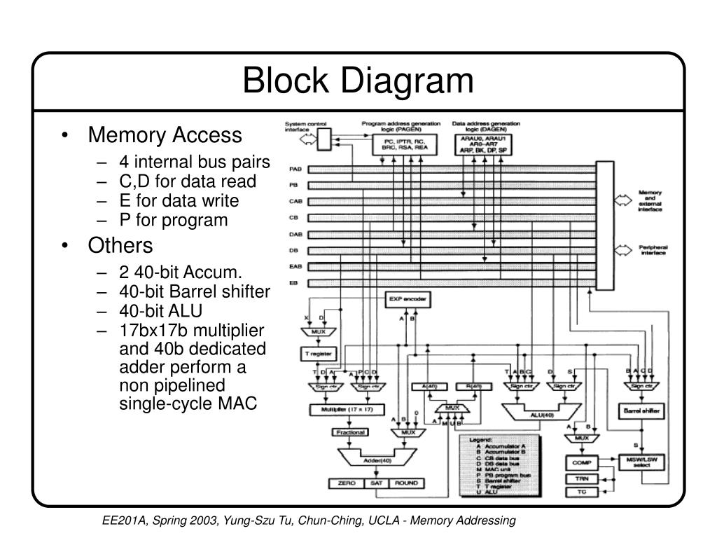 Block Diagram • Memory Access • 4 internal bus pairs • C,D for data read • E for data write • P for program • Others • 2 40-bit Accum. • 40-bit Barrel shifter • 40-bit ALU • 17bx17b multiplier and 40b dedicated adder perform a non pipelined single-cycle MAC EE201A, Spring 2003, Yung-Szu Tu, Chun-Ching, UCLA - Memory Addressing