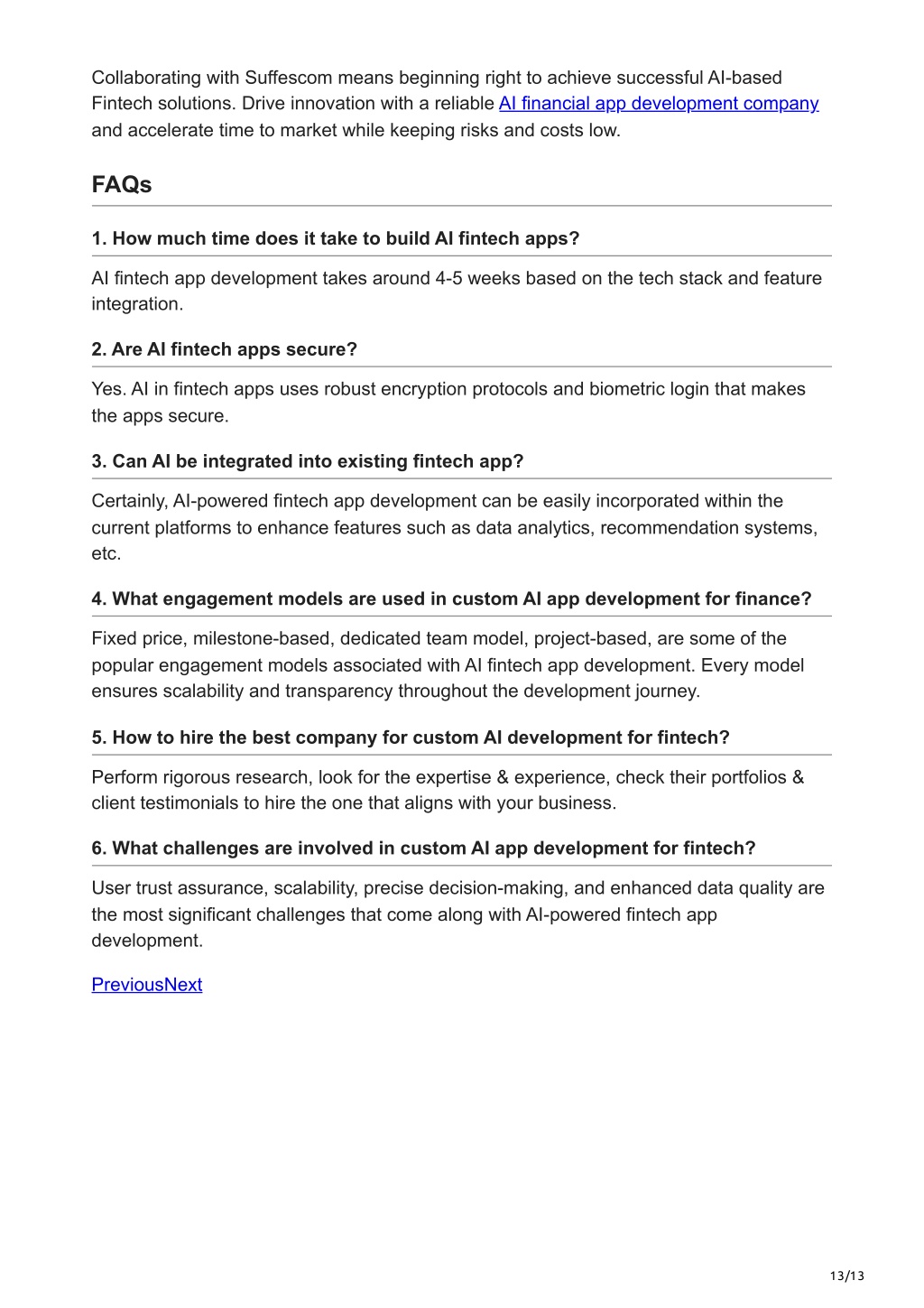 Collaborating with Suffescom means beginning right to achieve successful AI-based Fintech solutions. Drive innovation with a reliable AI financial app development company and accelerate time to market while keeping risks and costs low. FAQs 1. How much time does it take to build AI fintech apps? AI fintech app development takes around 4-5 weeks based on the tech stack and feature integration. 2. Are AI fintech apps secure? Yes. AI in fintech apps uses robust encryption protocols and biometric login that makes the apps secure. 3. Can AI be integrated into existing fintech app? Certainly, AI-powered fintech app development can be easily incorporated within the current platforms to enhance features such as data analytics, recommendation systems, etc. 4. What engagement models are used in custom AI app development for finance? Fixed price, milestone-based, dedicated team model, project-based, are some of the popular engagement models associated with AI fintech app development. Every model ensures scalability and transparency throughout the development journey. 5. How to hire the best company for custom AI development for fintech? Perform rigorous research, look for the expertise & experience, check their portfolios & client testimonials to hire the one that aligns with your business. 6. What challenges are involved in custom AI app development for fintech? User trust assurance, scalability, precise decision-making, and enhanced data quality are the most significant challenges that come along with AI-powered fintech app development. PreviousNext 13/13