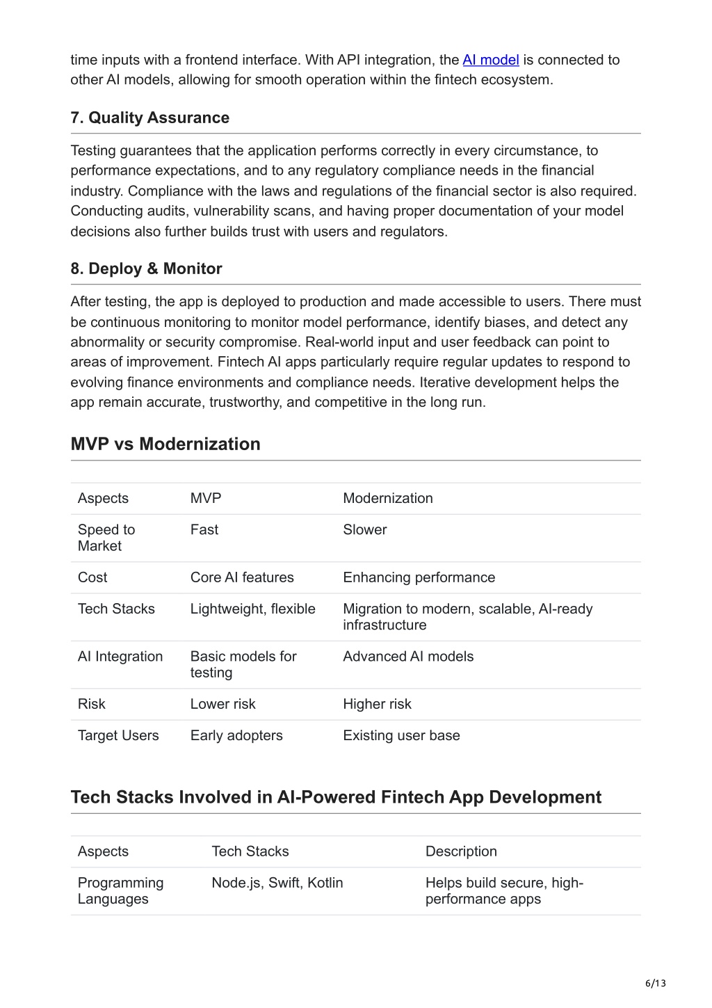 time inputs with a frontend interface. With API integration, the AI model is connected to other AI models, allowing for smooth operation within the fintech ecosystem. 7. Quality Assurance Testing guarantees that the application performs correctly in every circumstance, to performance expectations, and to any regulatory compliance needs in the financial industry. Compliance with the laws and regulations of the financial sector is also required. Conducting audits, vulnerability scans, and having proper documentation of your model decisions also further builds trust with users and regulators. 8. Deploy & Monitor After testing, the app is deployed to production and made accessible to users. There must be continuous monitoring to monitor model performance, identify biases, and detect any abnormality or security compromise. Real-world input and user feedback can point to areas of improvement. Fintech AI apps particularly require regular updates to respond to evolving finance environments and compliance needs. Iterative development helps the app remain accurate, trustworthy, and competitive in the long run. MVP vs Modernization Aspects MVP Modernization Speed to Market Fast Slower Cost Core AI features Enhancing performance Tech Stacks Lightweight, flexible Migration to modern, scalable, AI-ready infrastructure AI Integration Basic models for testing Advanced AI models Risk Lower risk Higher risk Target Users Early adopters Existing user base Tech Stacks Involved in AI-Powered Fintech App Development Aspects Tech Stacks Description Programming Languages Node.js, Swift, Kotlin Helps build secure, high- performance apps 6/13
