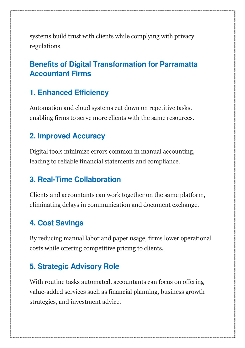systems build trust with clients while complying with privacy regulations. Benefits of Digital Transformation for Parramatta Accountant Firms 1. Enhanced Efficiency Automation and cloud systems cut down on repetitive tasks, enabling firms to serve more clients with the same resources. 2. Improved Accuracy Digital tools minimize errors common in manual accounting, leading to reliable financial statements and compliance. 3. Real-Time Collaboration Clients and accountants can work together on the same platform, eliminating delays in communication and document exchange. 4. Cost Savings By reducing manual labor and paper usage, firms lower operational costs while offering competitive pricing to clients. 5. Strategic Advisory Role With routine tasks automated, accountants can focus on offering value-added services such as financial planning, business growth strategies, and investment advice.