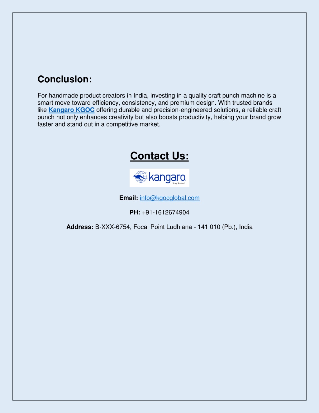 Conclusion: For handmade product creators in India, investing in a quality craft punch machine is a smart move toward efficiency, consistency, and premium design. With trusted brands like Kangaro KGOC offering durable and precision-engineered solutions, a reliable craft punch not only enhances creativity but also boosts productivity, helping your brand grow faster and stand out in a competitive market. Contact Us: Email: info@kgocglobal.com PH: +91-1612674904 Address: B-XXX-6754, Focal Point Ludhiana - 141 010 (Pb.), India