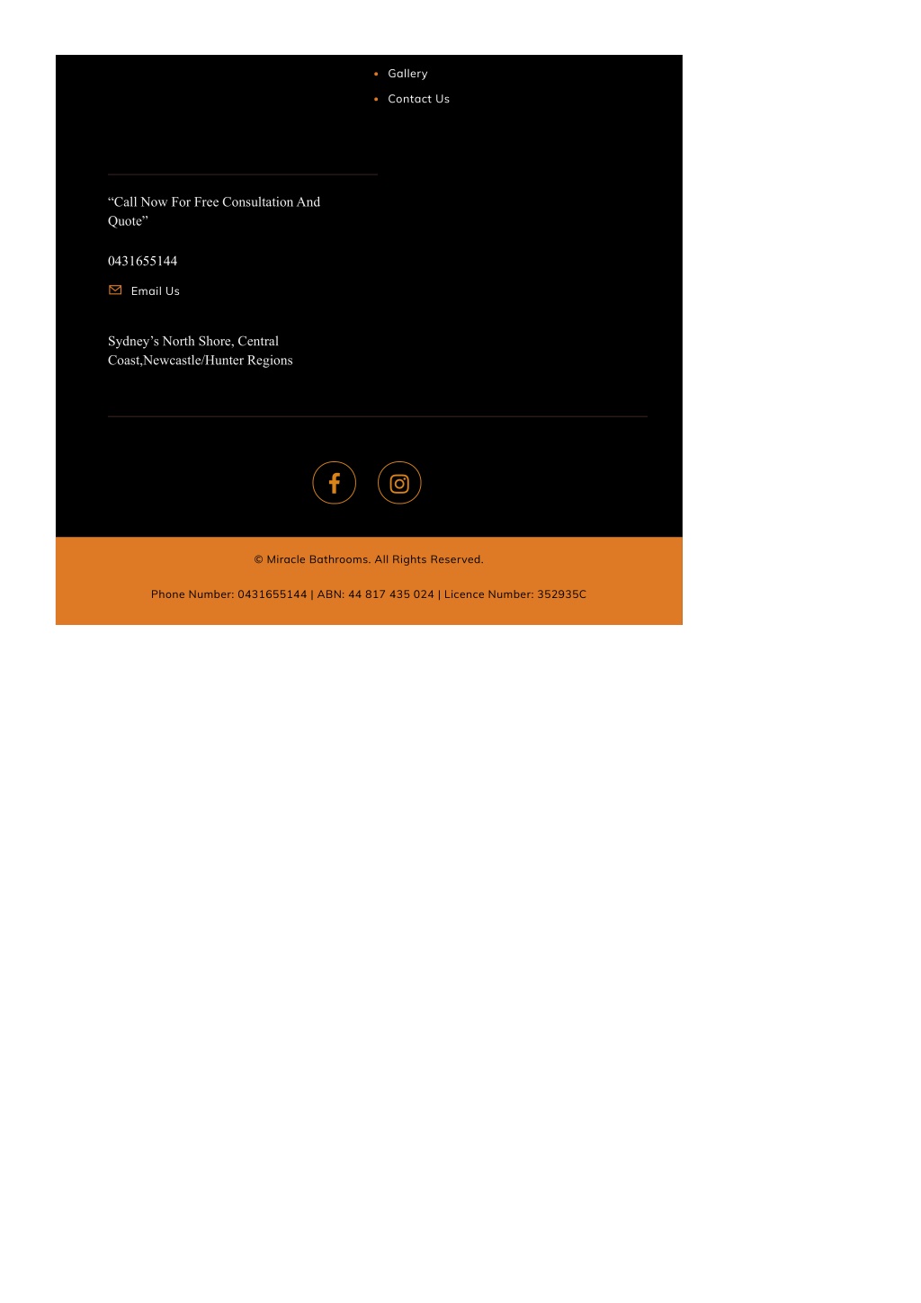 Gallery Contact Us “Call Now For Free Consultation And Quote” 0431655144 Email Us Sydney’s North Shore, Central Coast,Newcastle/Hunter Regions © Miracle Bathrooms. All Rights Reserved. Phone Number: 0431655144 | ABN: 44 817 435 024 | Licence Number: 352935C