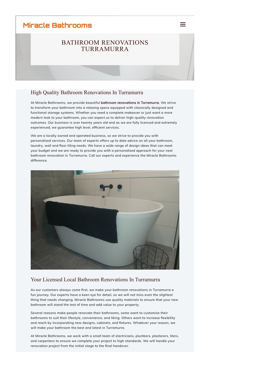 BATHROOM RENOVATIONS TURRAMURRA High Quality Bathroom Renovations In Turramurra At Miracle Bathrooms, we provide beautiful bathroom renovations in Turramurra to transform your bathroom into a relaxing space equipped with classically designed and functional storage systems. Whether you need a complete makeover or just want a more modern look to your bathroom, you can expect us to deliver high-quality renovation outcomes. Our business is over twenty years old and as we are fully licenced and extremely experienced, we guarantee high level, ef몭cient services. bathroom renovations in Turramurra. We strive We are a locally owned and operated business, so we strive to provide you with personalised services. Our team of experts offers up to date advice on all your bathroom, laundry, wall and 몭oor tiling needs. We have a wide range of design ideas that can meet your budget and we are ready to provide you with a personalised approach for your next bathroom renovation in Turramurra. Call our experts and experience the Miracle Bathrooms difference. Your Licensed Local Bathroom Renovations In Turramurra As our customers always come 몭rst, we make your bathroom renovations in Turramurra a fun journey. Our experts have a keen eye for detail, so we will not miss even the slightest thing that needs changing. Miracle Bathrooms use quality materials to ensure that your new bathroom will stand the test of time and add value to your property. Several reasons make people renovate their bathrooms, some want to customise their bathrooms to suit their lifestyle, convenience, and liking. Others want to increase 몭exibility and reach by incorporating new designs, cabinets, and 몭xtures. Whatever your reason, we will make your bathroom the best and latest in Turramurra. At Miracle Bathrooms, we work with a small team of electricians, plumbers, plasterers, tilers, and carpenters to ensure we complete your project to high standards. We will handle your renovation project from the initial stage to the 몭nal handover.