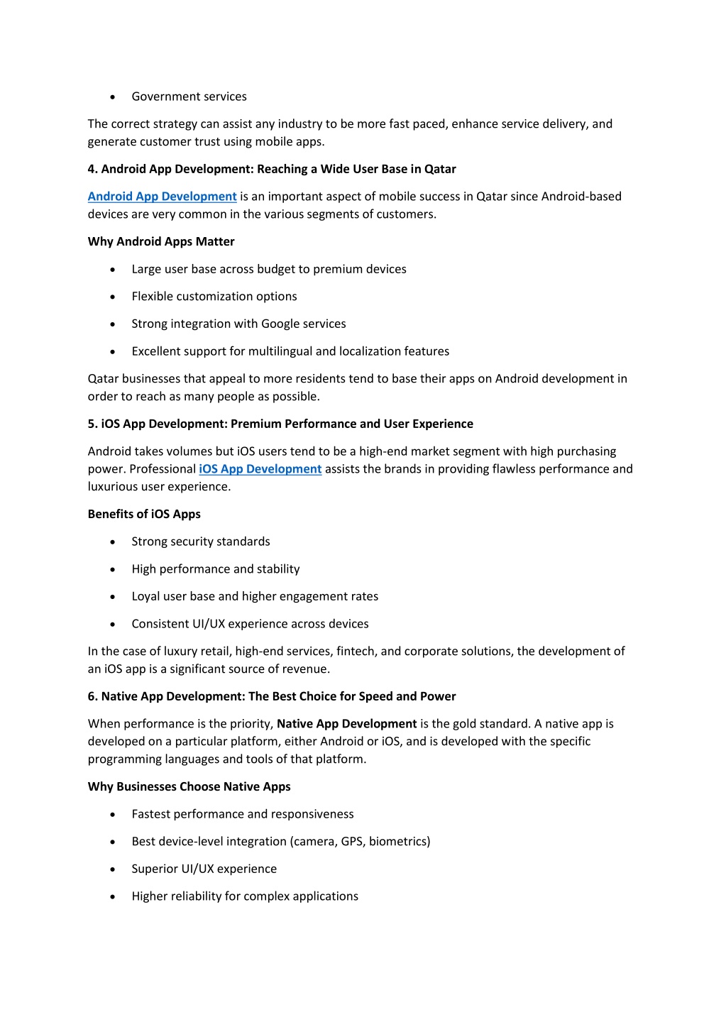 • Government services The correct strategy can assist any industry to be more fast paced, enhance service delivery, and generate customer trust using mobile apps. 4. Android App Development: Reaching a Wide User Base in Qatar Android App Development is an important aspect of mobile success in Qatar since Android-based devices are very common in the various segments of customers. Why Android Apps Matter • Large user base across budget to premium devices • Flexible customization options • Strong integration with Google services • Excellent support for multilingual and localization features Qatar businesses that appeal to more residents tend to base their apps on Android development in order to reach as many people as possible. 5. iOS App Development: Premium Performance and User Experience Android takes volumes but iOS users tend to be a high-end market segment with high purchasing power. Professional iOS App Development assists the brands in providing flawless performance and luxurious user experience. Benefits of iOS Apps • Strong security standards • High performance and stability • Loyal user base and higher engagement rates • Consistent UI/UX experience across devices In the case of luxury retail, high-end services, fintech, and corporate solutions, the development of an iOS app is a significant source of revenue. 6. Native App Development: The Best Choice for Speed and Power When performance is the priority, Native App Development is the gold standard. A native app is developed on a particular platform, either Android or iOS, and is developed with the specific programming languages and tools of that platform. Why Businesses Choose Native Apps • Fastest performance and responsiveness • Best device-level integration (camera, GPS, biometrics) • Superior UI/UX experience • Higher reliability for complex applications
