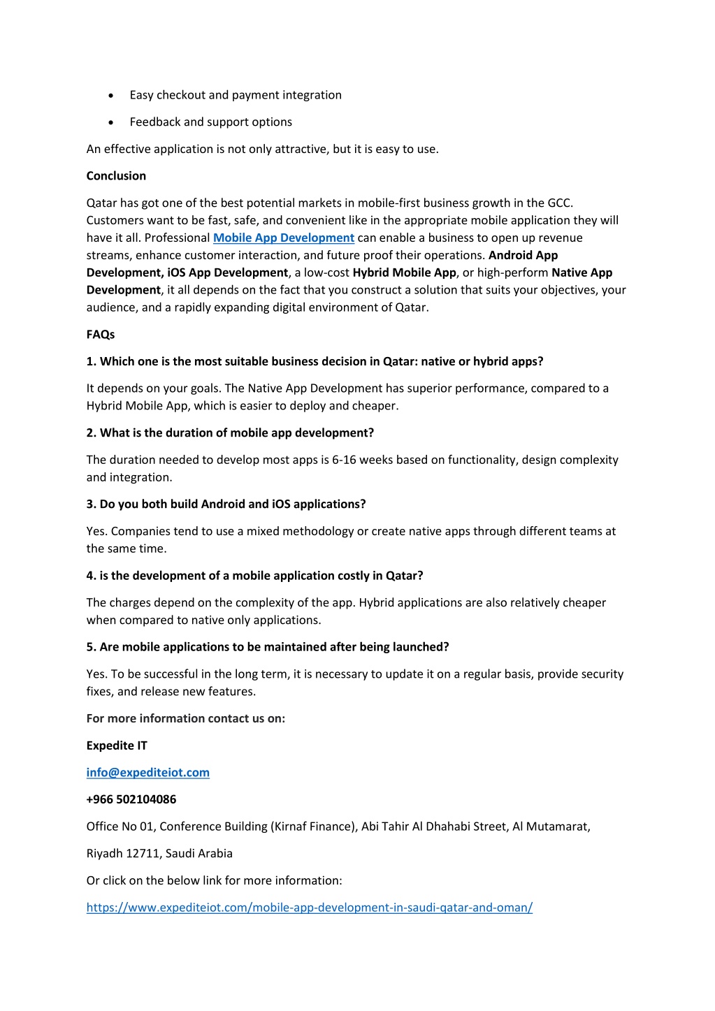• Easy checkout and payment integration • Feedback and support options An effective application is not only attractive, but it is easy to use. Conclusion Qatar has got one of the best potential markets in mobile-first business growth in the GCC. Customers want to be fast, safe, and convenient like in the appropriate mobile application they will have it all. Professional Mobile App Development can enable a business to open up revenue streams, enhance customer interaction, and future proof their operations. Android App Development, iOS App Development, a low-cost Hybrid Mobile App, or high-perform Native App Development, it all depends on the fact that you construct a solution that suits your objectives, your audience, and a rapidly expanding digital environment of Qatar. FAQs 1. Which one is the most suitable business decision in Qatar: native or hybrid apps? It depends on your goals. The Native App Development has superior performance, compared to a Hybrid Mobile App, which is easier to deploy and cheaper. 2. What is the duration of mobile app development? The duration needed to develop most apps is 6-16 weeks based on functionality, design complexity and integration. 3. Do you both build Android and iOS applications? Yes. Companies tend to use a mixed methodology or create native apps through different teams at the same time. 4. is the development of a mobile application costly in Qatar? The charges depend on the complexity of the app. Hybrid applications are also relatively cheaper when compared to native only applications. 5. Are mobile applications to be maintained after being launched? Yes. To be successful in the long term, it is necessary to update it on a regular basis, provide security fixes, and release new features. For more information contact us on: Expedite IT info@expediteiot.com +966 502104086 Office No 01, Conference Building (Kirnaf Finance), Abi Tahir Al Dhahabi Street, Al Mutamarat, Riyadh 12711, Saudi Arabia Or click on the below link for more information: https://www.expediteiot.com/mobile-app-development-in-saudi-qatar-and-oman/