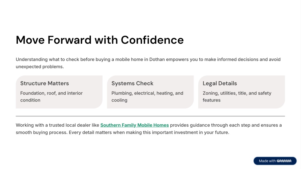 Move Forward with Confidence Understanding what to check before buying a mobile home in Dothan empowers you to make informed decisions and avoid unexpected problems. Structure Matters Systems Check Legal Details Foundation, roof, and interior condition Plumbing, electrical, heating, and cooling Zoning, utilities, title, and safety features Working with a trusted local dealer like Southern Family Mobile Homes provides guidance through each step and ensures a smooth buying process. Every detail matters when making this important investment in your future.