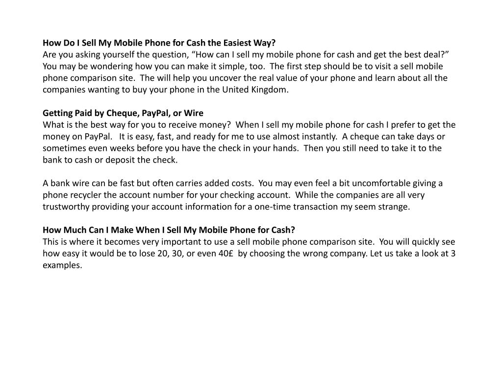 How Do I Sell My Mobile Phone for Cash the Easiest Way?Are you asking yourself the question, “How can I sell my mobile phone for cash and get the best deal?” You may be wondering how you can make it simple, too. The first step should be to visit a sell mobile phone comparison site. The will help you uncover the real value of your phone and learn about all the companies wanting to buy your phone in the United Kingdom.Getting Paid by Cheque, PayPal, or WireWhat is the best way for you to receive money? When I sell my mobile phone for cash I prefer to get the money on PayPal. It is easy, fast, and ready for me to use almost instantly. A cheque can take days or sometimes even weeks before you have the check in your hands. Then you still need to take it to the bank to cash or deposit the check.A bank wire can be fast but often carries added costs. You may even feel a bit uncomfortable giving a phone recycler the account number for your checking account. While the companies are all very trustworthy providing your account information for a one-time transaction my seem strange. How Much Can I Make When I Sell My Mobile Phone for Cash?This is where it becomes very important to use a sell mobile phone comparison site. You will quickly see how easy it would be to lose 20, 30, or even 40£ by choosing the wrong company. Let us take a look at 3 examples.