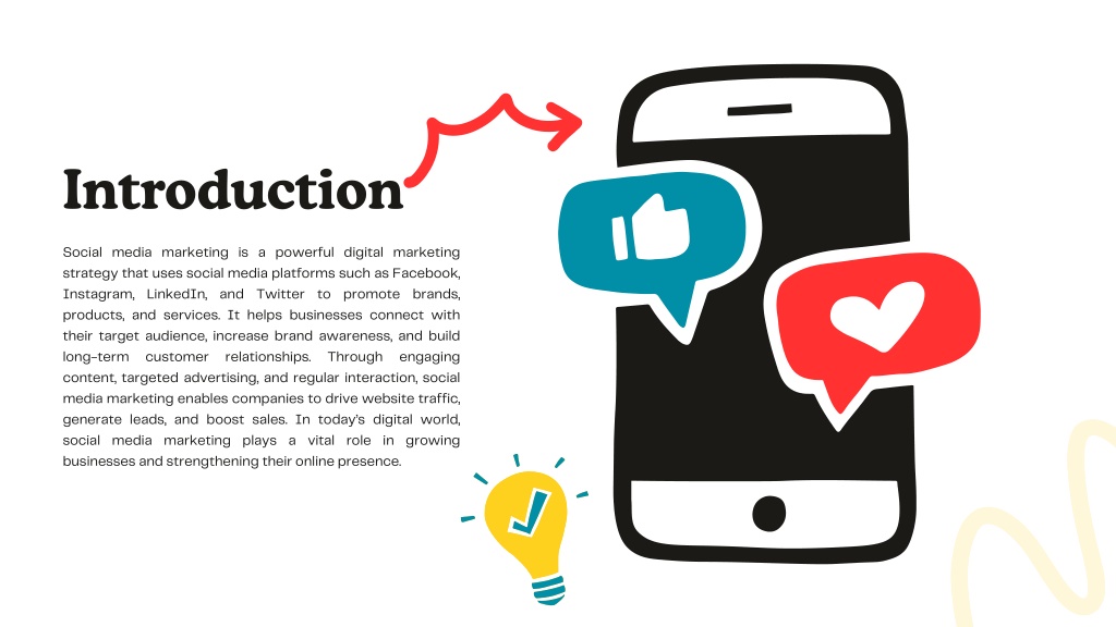 2. Introduction Social media marketing is a powerful digital marketing strategy that uses social media platforms such as Facebook, Instagram, LinkedIn, and Twitter to promote brands, products, and services. It helps businesses connect with their target audience, increase brand awareness, and build long-term customer relationships. Through engaging content, targeted advertising, and regular interaction, social media marketing enables companies to drive website traffic, generate leads, and boost sales. In today’s digital world, social media marketing plays a vital role in growing businesses and strengthening their online presence.